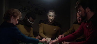 10. Conspiracy - This was a neat little first season episode. I am not a fan of gratuitous violence, but I have to say watching a guy's head explode on TV was cool. This episode was so different from everything else in Season 1 that is was refreshing and bold. I loved that Picard was involved in the fireworks. I really wish they had followed this up in later seasons.